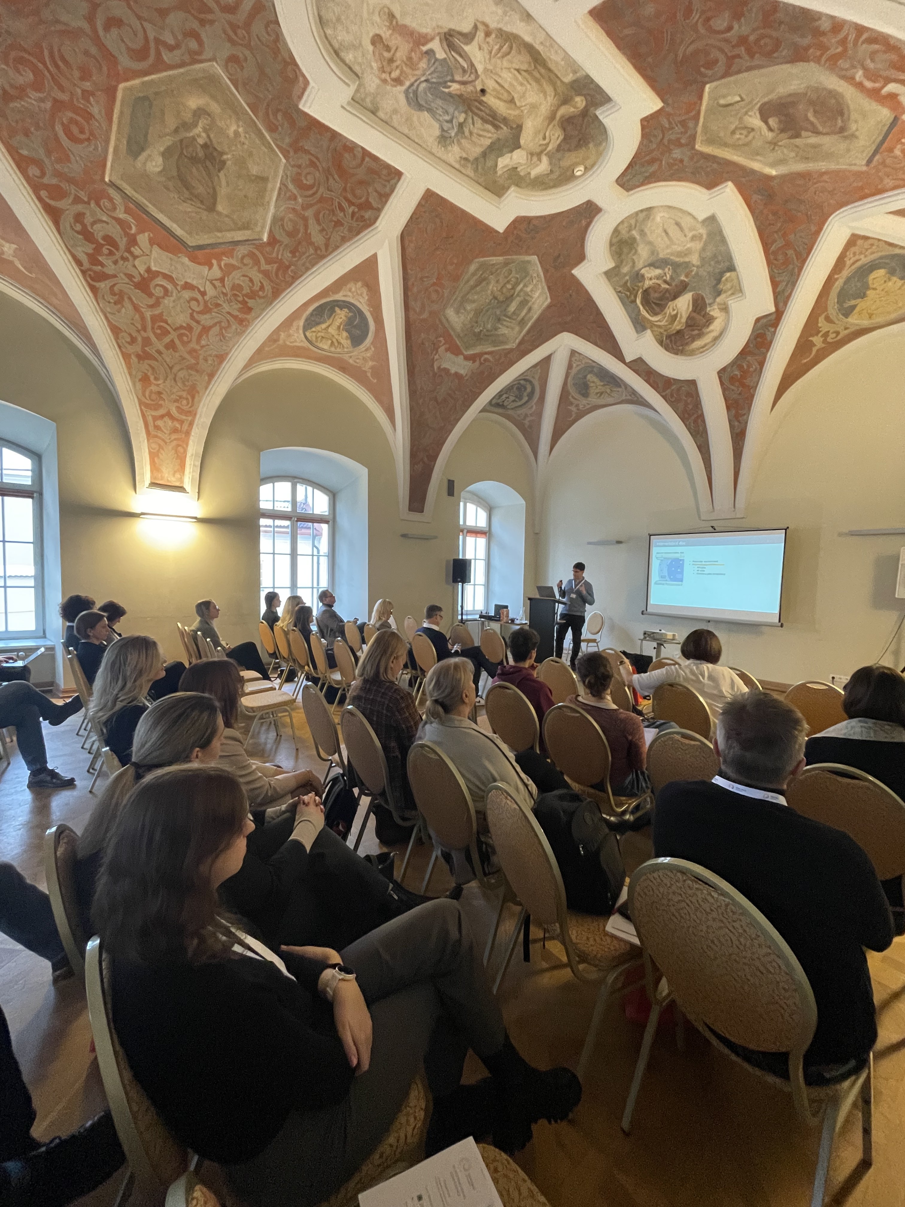 Po pietų mokslines diskusijas pratęsė dr. Claire Vinatier (Nantes Universitetas ir INSERM, Prancūzija), papasakojusi apie mitochondrijų senėjimą ir disfunkciją senstančiuose sąnariuose. Buvo pristatyti įdomūs duomenys apie pacientų chondrocitų mitochondrijų funcijos tyrimus ir atrastus oksidacinio ir glikolizinio gliukozės metabolizmo pokyčius, fermentų trūkumą ir kaip tai gali būti svarbu kuriant gydymo įrankius. Vėliau kalbėjęs dr. Romain Guiho (Nantes Universitetas ir INSERM, Prancūzija) pristatė duomenis apie senėjimo procesus tarpslanksteliniame diske, jo degeneraciją, plačiai apimančius tyrimo metodus (transkriptominiai disko ląstelių tyrimai visame pasaulyje) bei jų rezultatus, suaktyvėjančius procesus senstančiose disko ląstelėse, kurie aptinkami transkriptominiais metodais, ląstelių skirtingumą ir pasiskirstymą, bei tokių pastebėjimų svarbą tyrimams ateityje.